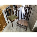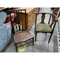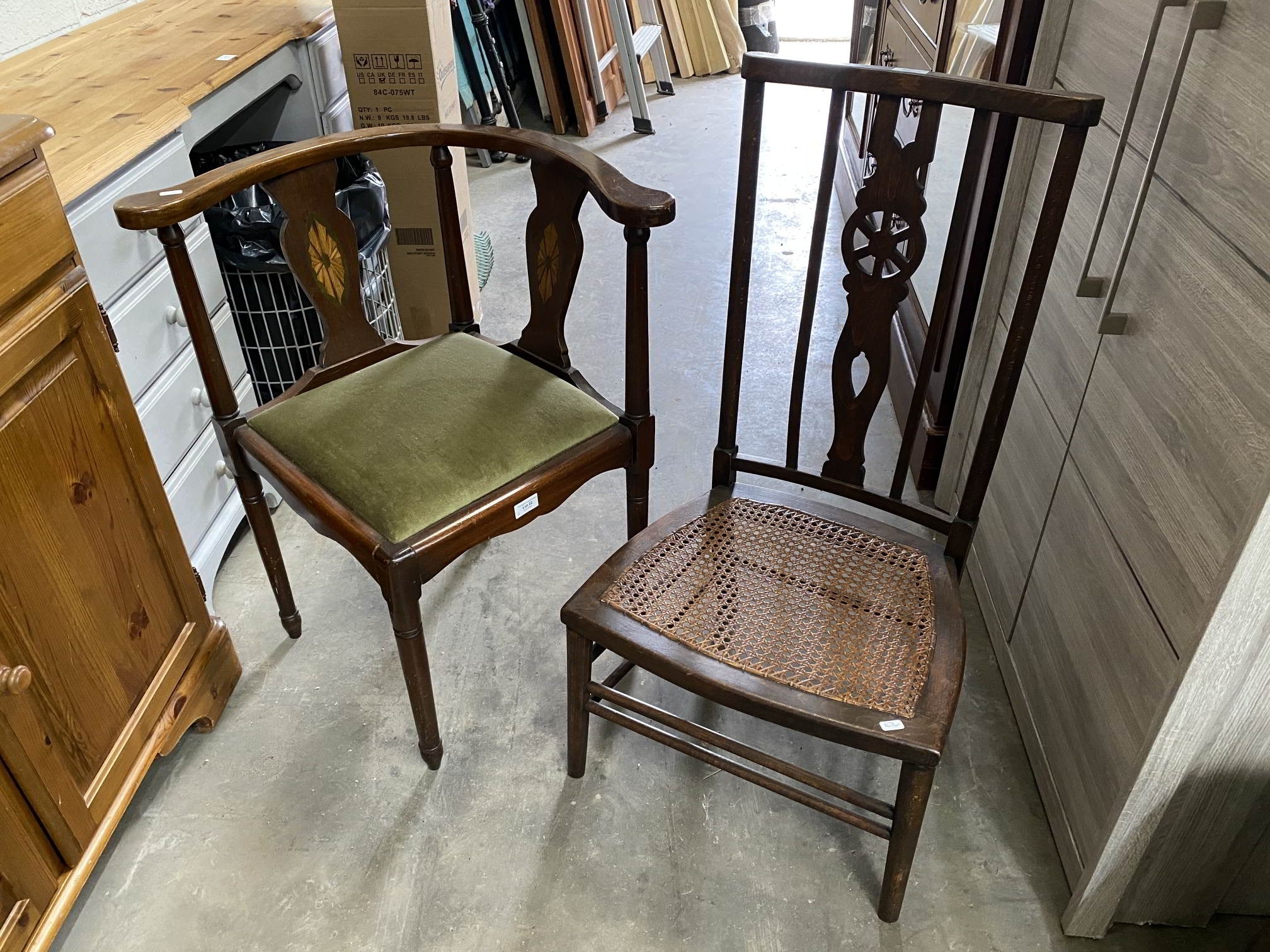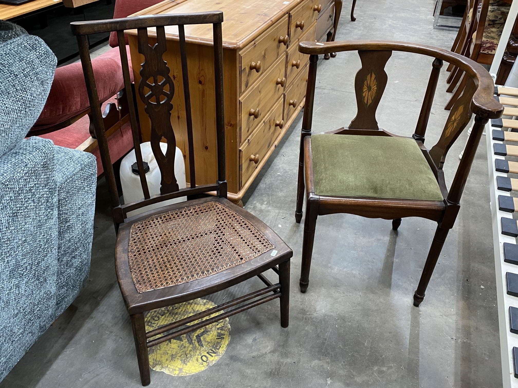 Victorian mahogany inlaid corner chair 67W & an Arts & Crafts wheel back side chair 47W