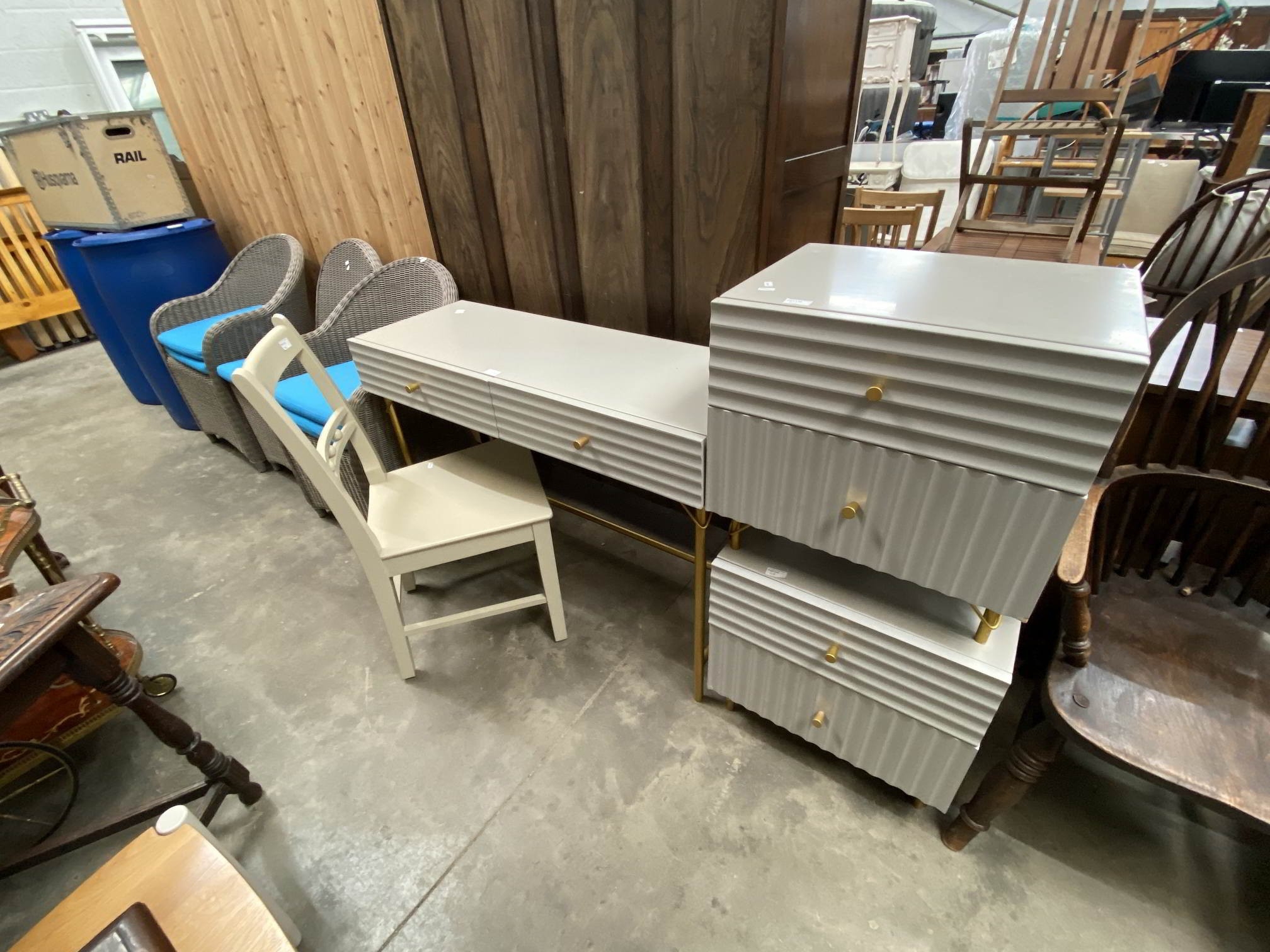 Barker & Stonehouse 'Quinn' dressing table 81H 110W 41D with 2 matching bedside chests 53H 52W 41D and a contrasting chair