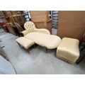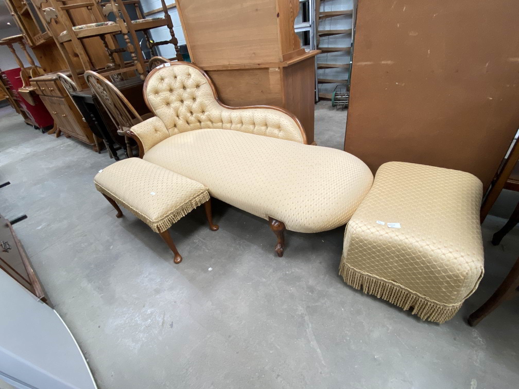 Victorian walnut framed Chaise Longue 85H 165W 70D, matching footstool 38H 80W 33D and a box footstool 35H 57W 40D