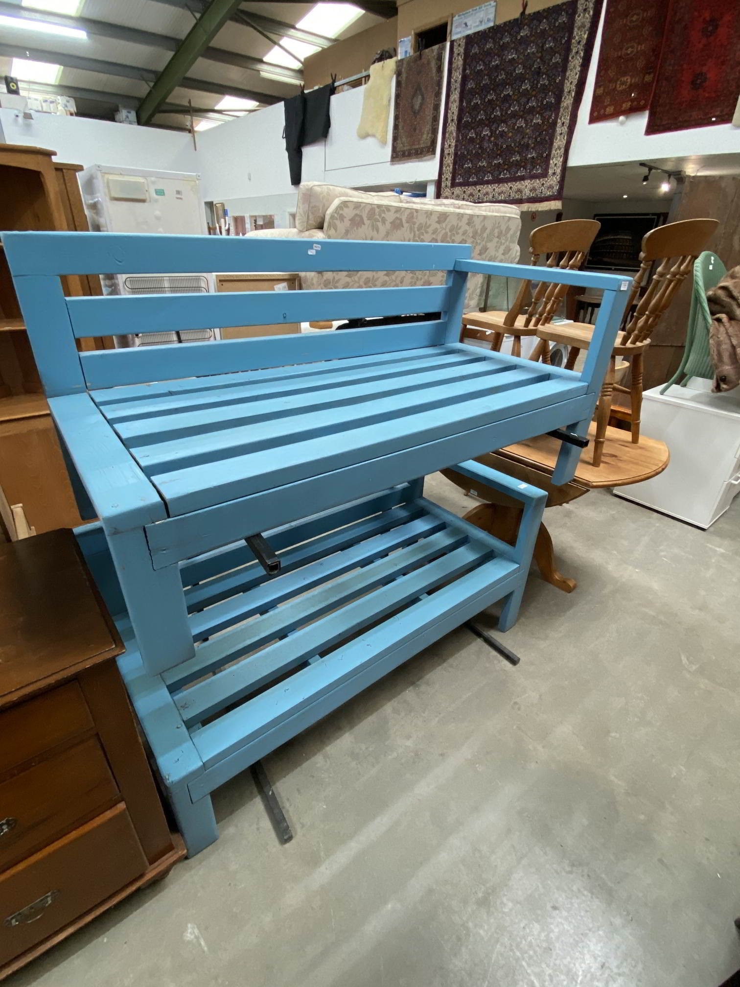 2 blue painted wooden garden benches 74H 148W 68D ('L' shaped)