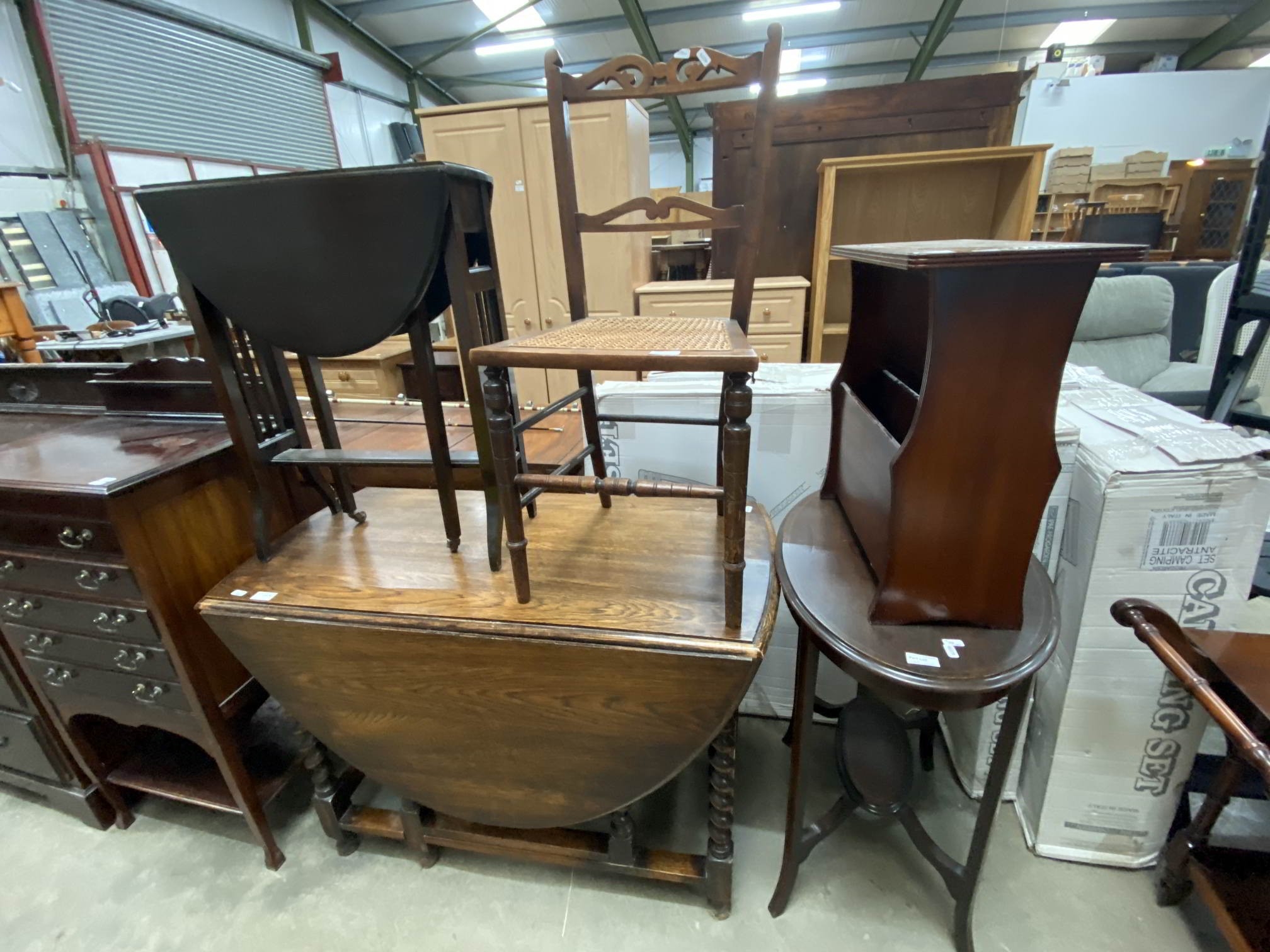Oak barley twist drop leaf table 73H 106W 48-140D, mahogany Sutherland table 67H 53W 21-71D etc